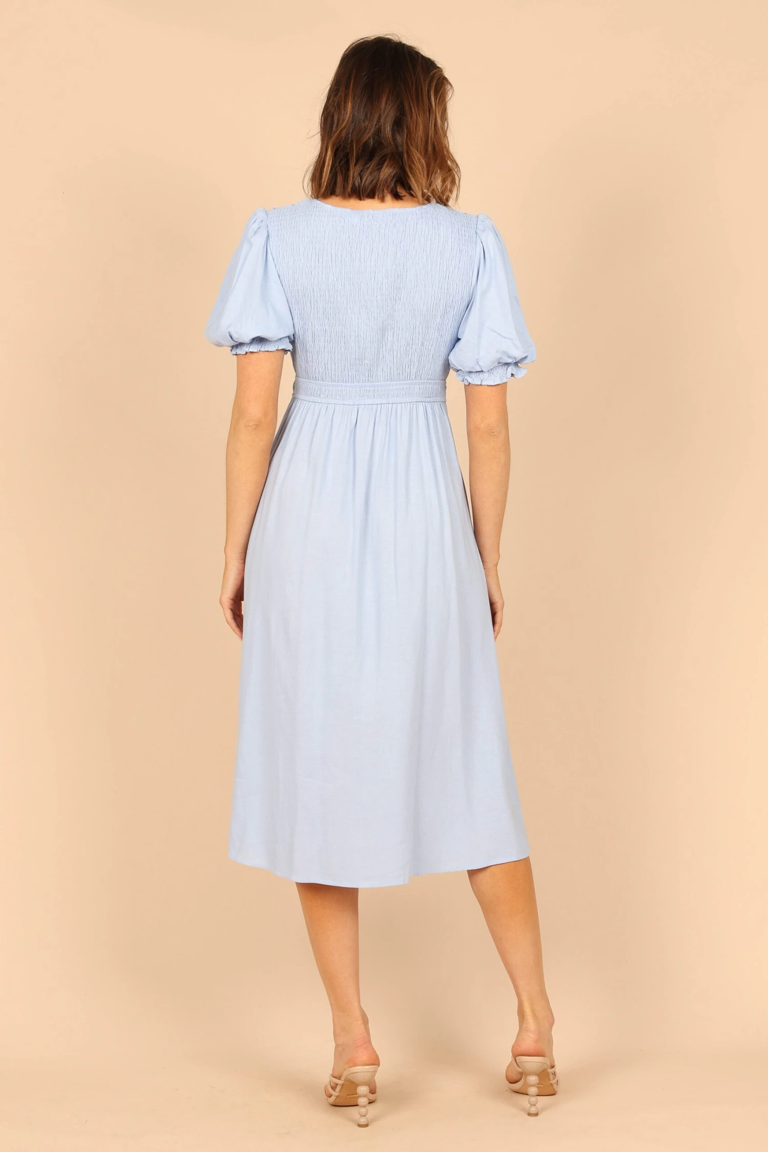 | DETAILS This midi length dress is the perfect choice for any occasion! With its v-neckline tied close and short sleeves with elasticized cuffs, you’ll look super chic and stylish.