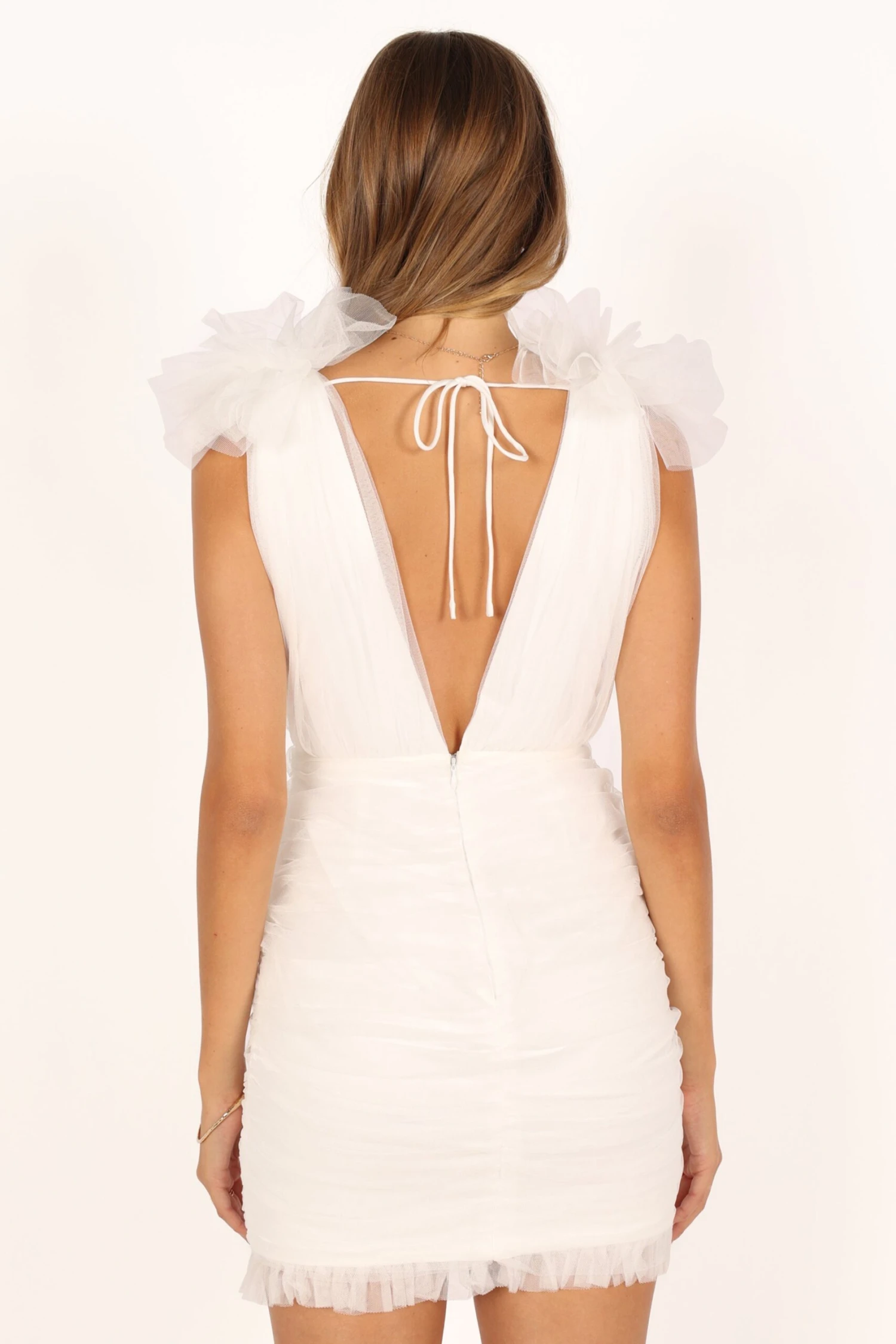 | DETAILS Feel like a party princess in our exquisite mini tulle style dress! With its deep v neckline, non adjustable straps with ruffle detail and sleeveless design, you’ll be looking your best to make an entrance.