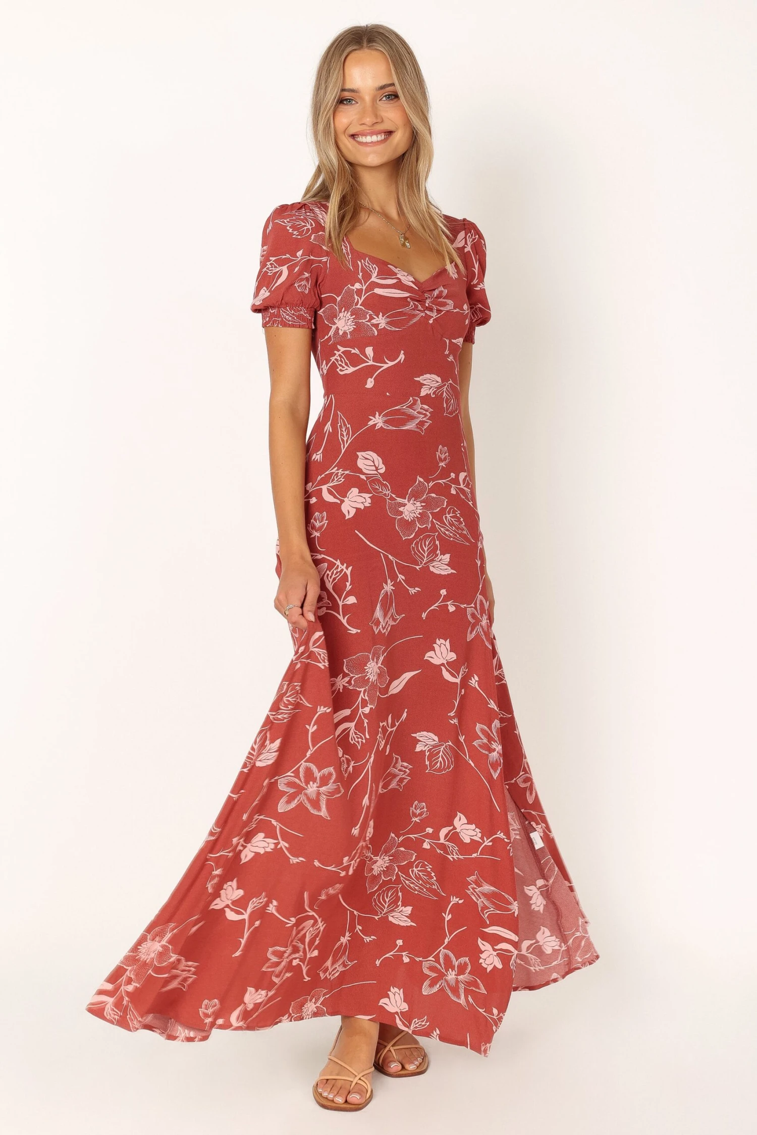 | DETAILS This maxi dress is a timeless classic with its shirred cuffs and round neckline. The ruched bust detailing adds an elegant touch, while the front split gives you a bit of extra movement for maximum comfort.
