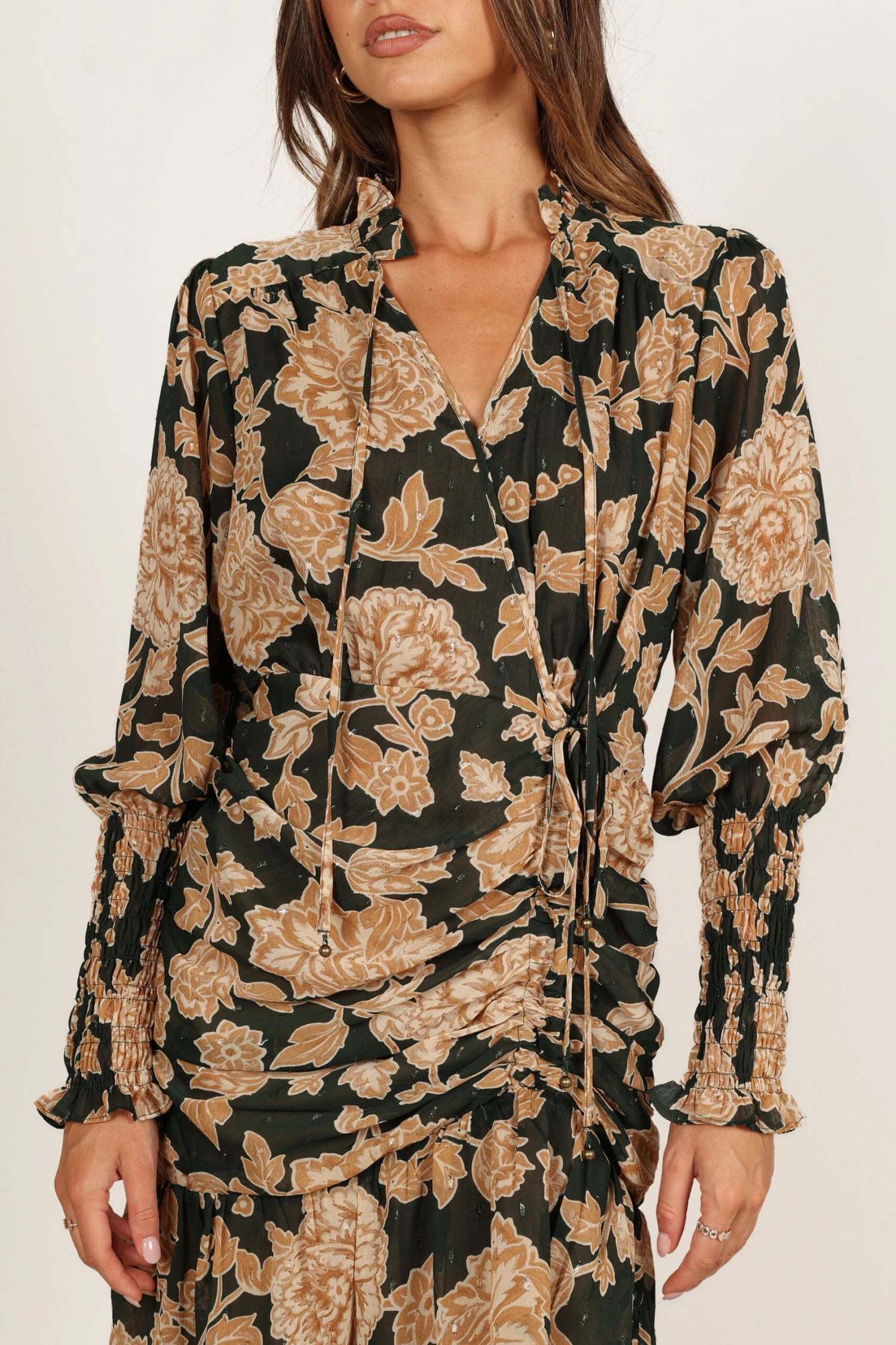 | DETAILS This mini dress is a fun flirty addition to your wardrobe! It features an overlay neckline with ruffle detail and tie close, as well as a press stud button on the neckline. The long sleeves have shirred cuffs which give the dress a unique look.