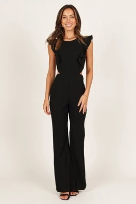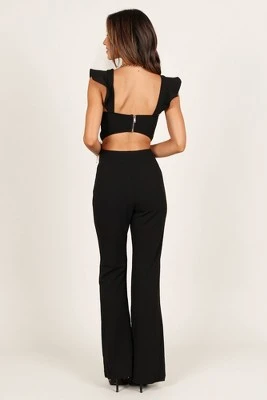 This jumpsuit is the perfect piece of event wear for any formal occasion. Featuring a round neckline, short ruffle sleeves, and a back cut out feature with silver zip, this jumpsuit provides just the right amount of drama. The side invisible zip ensures the jumpsuit fits snugly against your figure while the slight flare style pant adds a classic touch.